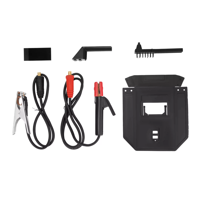 اقلام همراه : کابل گیره اتصال به زمین(طول: 1.2متر) ، کابل الکترود(طول: 1.8 متر) ، چکش برس‌دار ، کلاه ایمنی جوشکاری